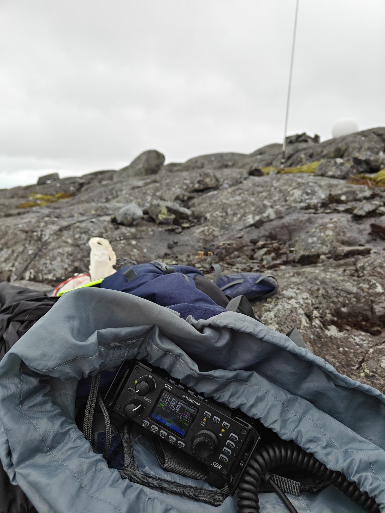 On the top of the summit there is a huge radio tower operated by one of the national telecom companies and a not-so-secret military radar installation. I set up my vertical antenna and its counterpoise wires and got it adjusted to 20m. I love that it gets an SWR of 1.0 without using the G90 tuner—which in turn means I can use my little PA without any SWR issues. I did a test call with a person from the Netherlands (unfortunately I forgot to note the callsign). Then I tried to reach some fellow Norwegians that I was chatting with on Discord, but it seems we were inside the skip distance so no contact was possible there.