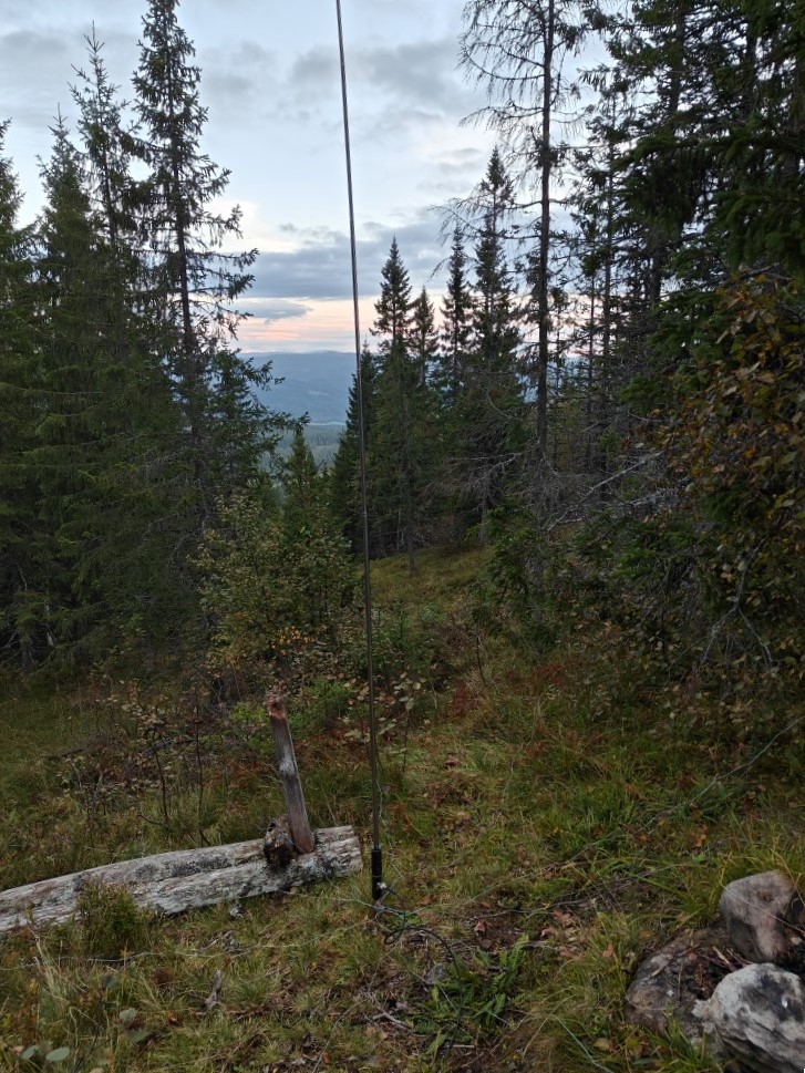 For my second SOTA activation I decided to try something new. Liaåsen, LA/ST-011 is a small hill just outside Trondheim, Norway with a transmitter mast on top. It’s a popular location for hiking and quite popular with SOTA hams. I have been there before, but for other reasons than SOTA. For my previous activation I used a PAC-12 7MHz-50MHz antenna from Aliexpress and it worked okay, but it was quite narrowbanded and I wanted to remedy that. In my box of radio stuff I had a 5.6m whip antenna that would be the perfect length for 20m. Since it’s segmented, it would also allow me to easily do 17m and 10m. Very fortunately there was a bench we could install ourselves and the equipment on.