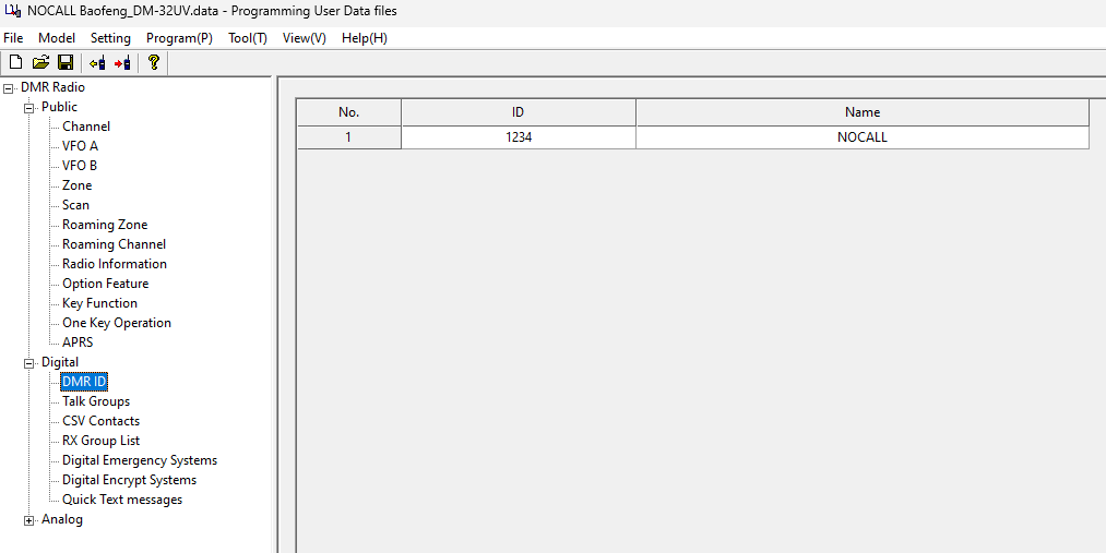 Remember to change your DMR ID and callsign before uploading! You do this in the Digital -> DMR ID menu in the CPS DMR program.